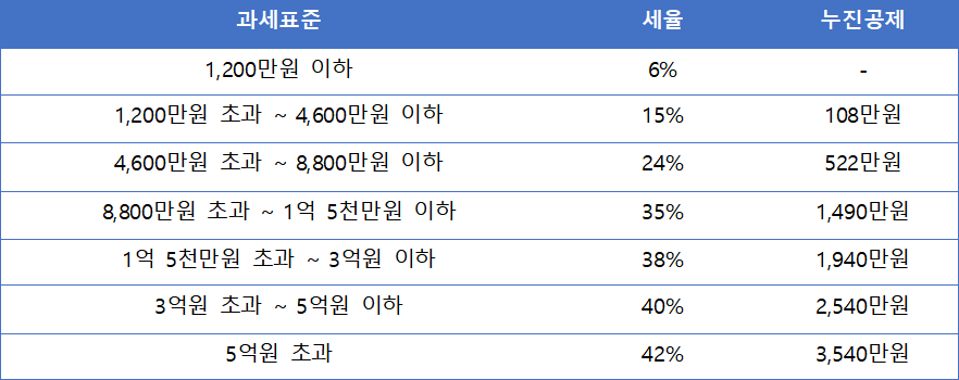 2020년 기준, 종합소득세율 및 근로소득세율은 위 표와 같습니다. 과세표준과 세율이 동일합니다. 계산 방법은 간단히 (과세 금액 * 세율) - 누진공제액으로 계산하시면 됩니다.