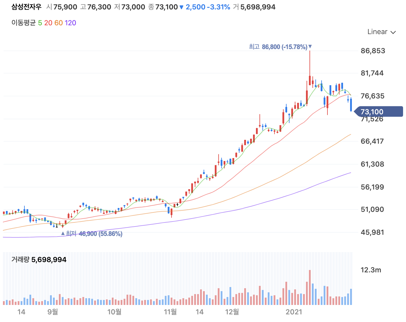 몇일간의 평균을 내는 지에 따라서도 구분하는데, 보통 많이 사용하는건 5일, 10일, 20일, 60일, 120일 이평선입니다. 한 주에 5일 장이 열리기 때문에, 각각 대략 1주, 2주, 4주, 12주, 24주 평균 가격을 보여준다고 생각하시면 됩니다.