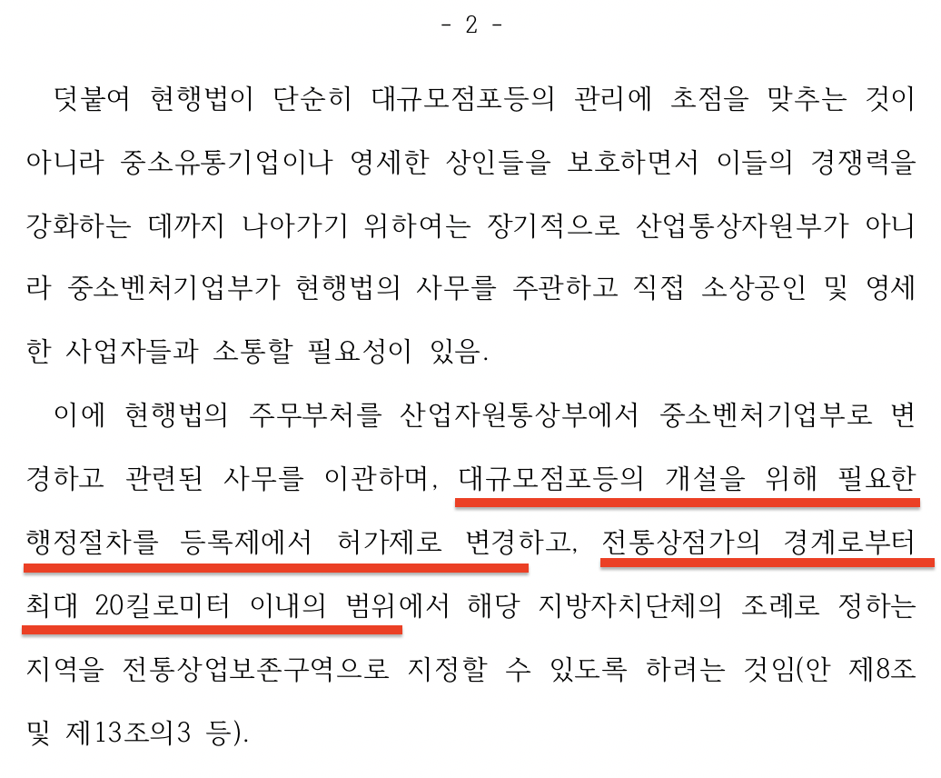 이에 현행법의 주무부처를 산업자원통상부에서 중소벤처기업부로 변경하고 관련된 사무를 이관하며, 대규모점포등의 개설을 위해 필요한 행정절차를 등록제에서 허가제로 변경하고, 전통상점가의 경계로부터 최대 20킬로미터 이내의 범위에서 해당 지방자치단체의 조례로 정하는 지역을 전통상업보존구역으로 지정할 수 있도록 하려는 것임(안 제8조 및 제13조의3 등).