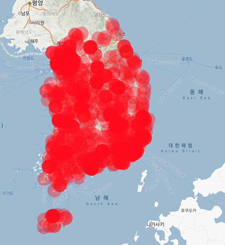 클리앙의 어떤 유저분이 공공데이터를 활용해 전국의 전통시장 반경 20km를 색칠해본 모습입니다. 대형마트가 들어올 수 있는 지역이 거의 없는 것을 확인할 수 있습니다.