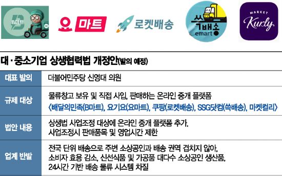 더불어민주당 신영대 의원 대표발의 예정인 "대중소기업 상생협력법 개정안"의 초안은 배달의민족, 쿠팡(로켓배송), 마켓컬리, SSG닷컴(쓱배송) 등의 규제 내용을 담고 있습니다.