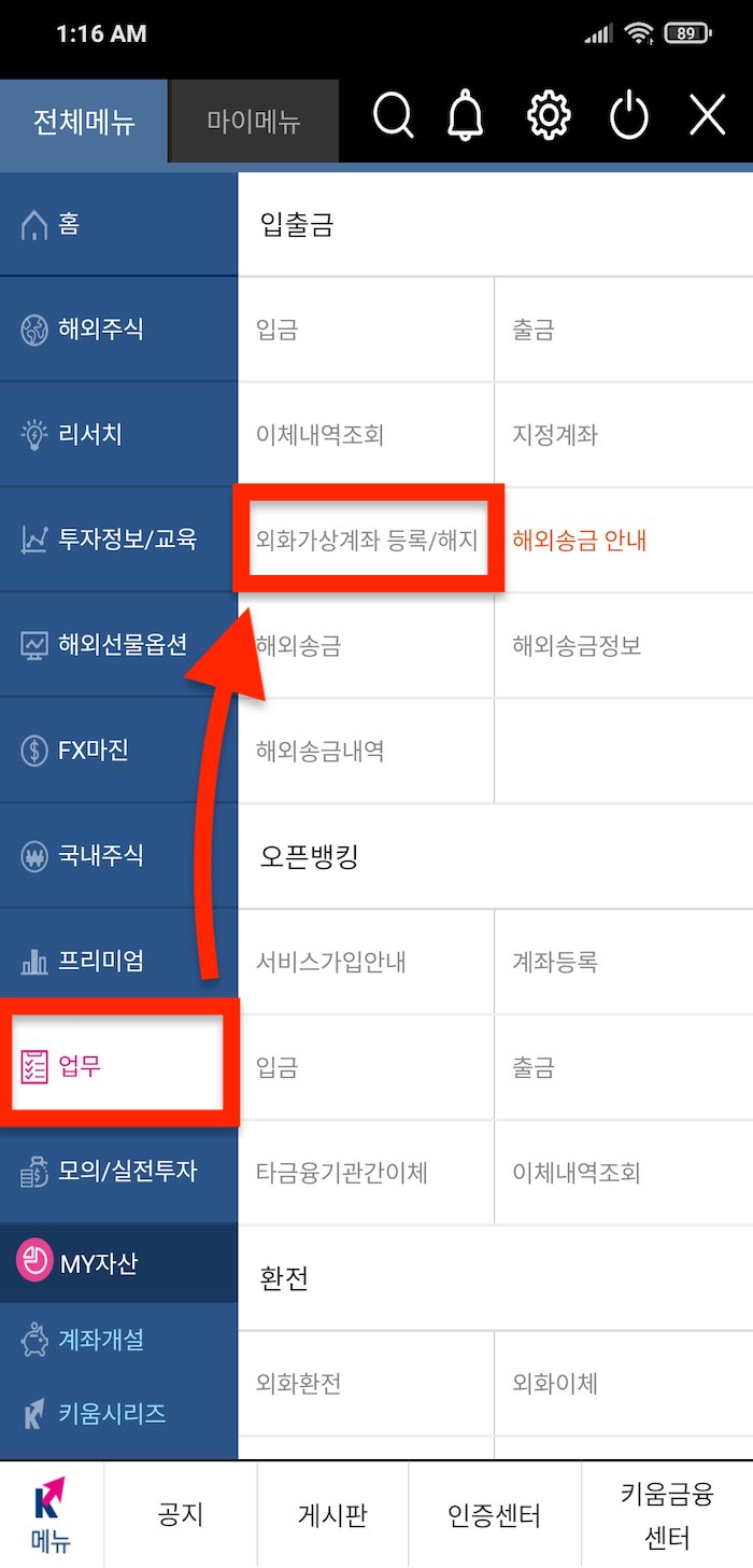 먼저 전체 메뉴에서 "업무 - 외화가상계좌 등록/해지" 메뉴로 들어갑니다.
