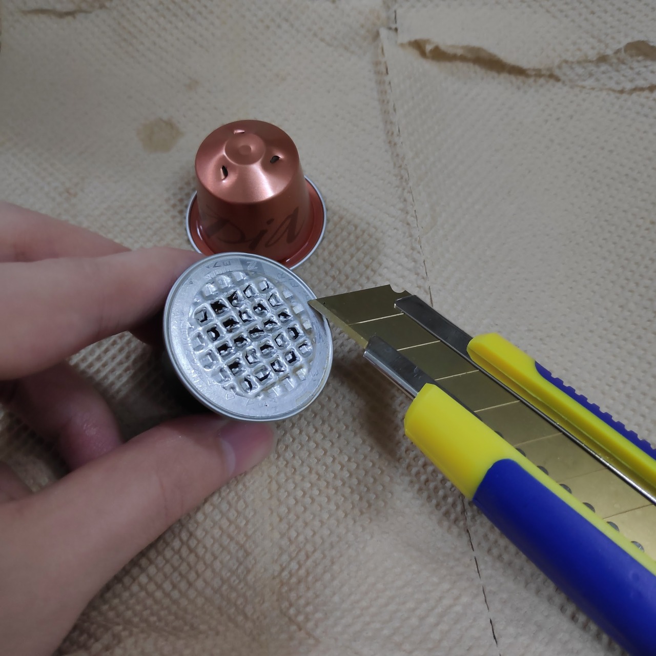 캡슐을 쟁반 위에 올려 놓으셨다면, 커터칼이나 칼 등으로 알루미늄박을 벗겨줍니다.