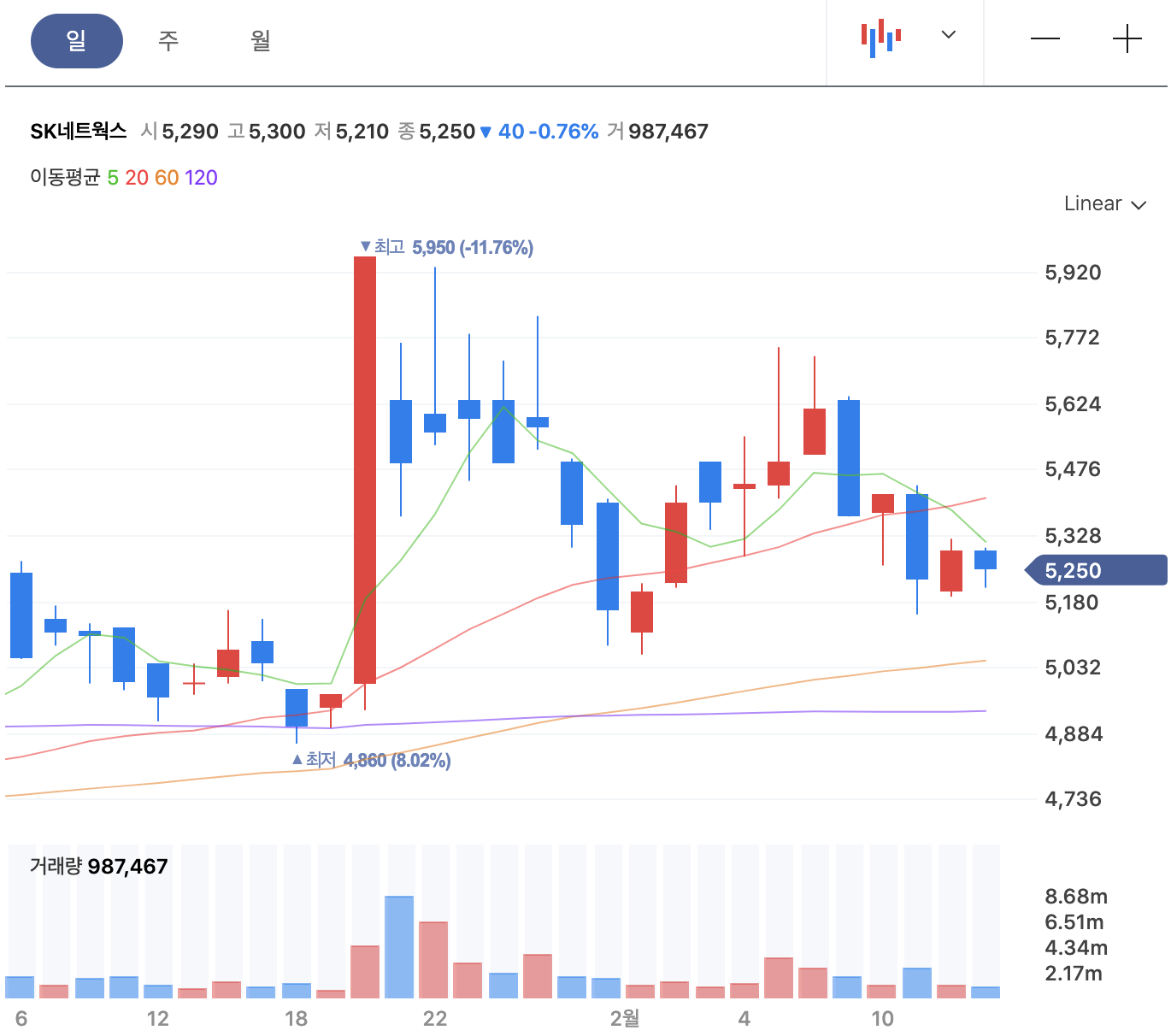 네이버 금융에서 캡처한 SK네트웍스 일봉 차트를 갖고와 봤습니다.
