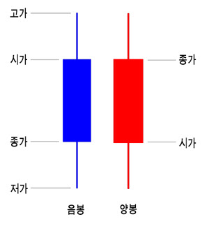 종가가 시가보다 낮으면(=가격이 떨어졌으면) 음봉, 종가가 시가보다 높으면(=가격이 올랐으면) 양봉이라고 합니다.
