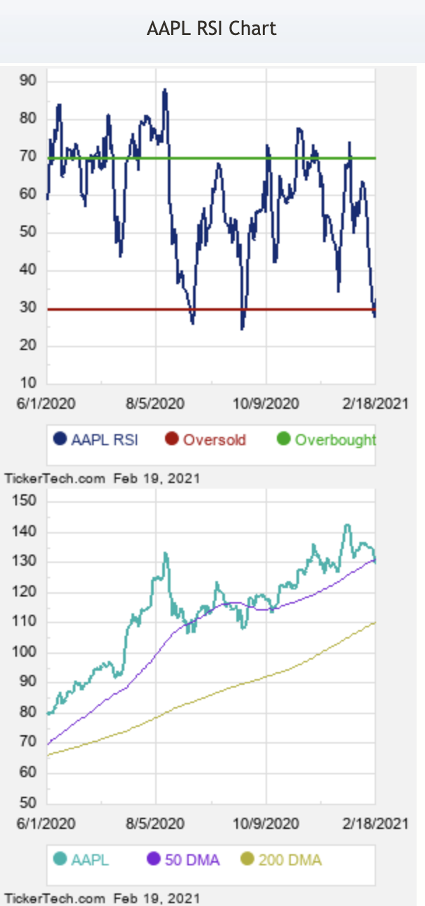 글쓰는 날짜 기준 애플(AAPL) 주식의 RSI 차트와 주가 차트를 한번 보겠습니다.
