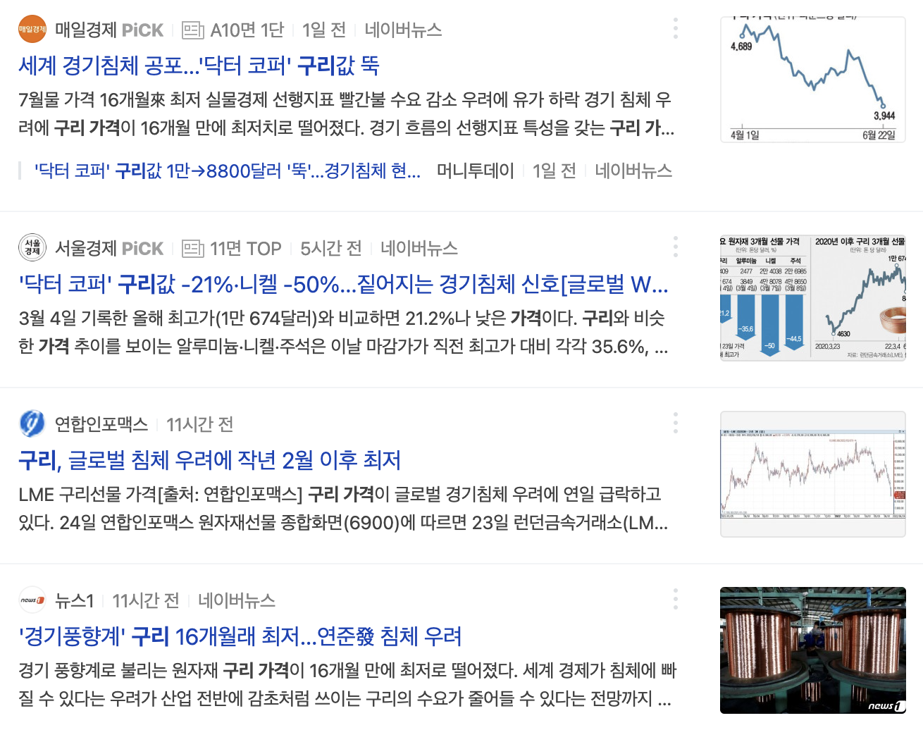 구리 가격의 변동에서 세계경제의 호황, 불황의 방향성을 엿볼 수 있습니다.