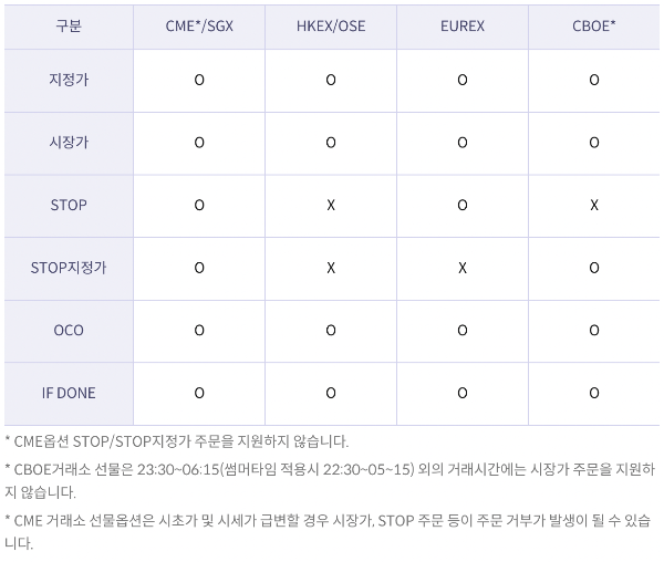 - 거래소마다 LIMIT, STOP 주문이 시장가로 접수되거나 +-10틱으로 접수되는 등 차이가 있으니 인지하셔야 합니다. (ex. 키움증권에서는 시장가 주문을 지원하지 않는 거래소인 HKEX에서는 +-10틱의 지정가로 주문이 실행됩니다)