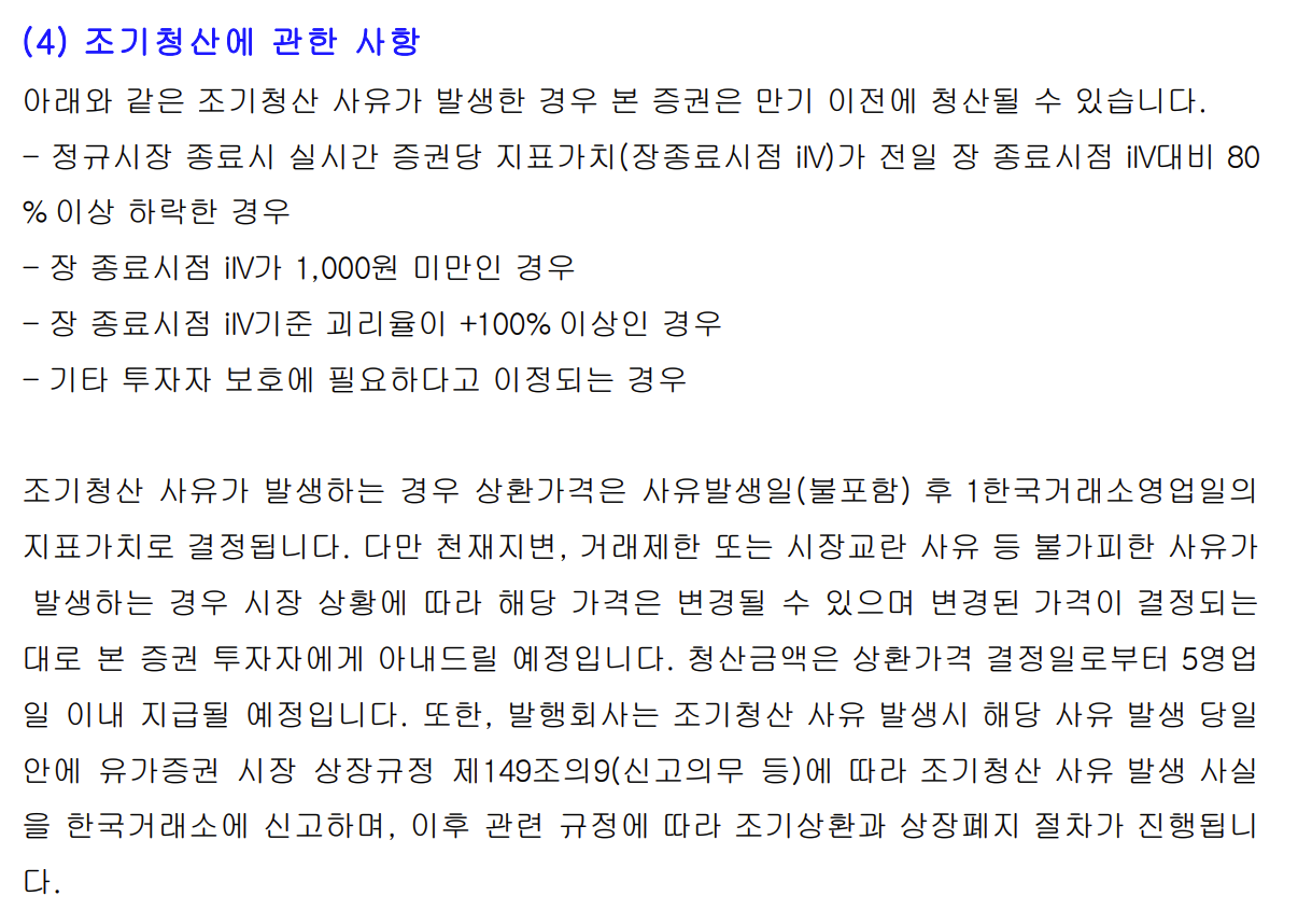 이외에도 괴리율이 특정 범위를 넘거나, 기타 거래소나 증권사에서 투자자 보호에 필요하다 생각되는 경우 조기청산될 수 있는 점 유의해주세요.