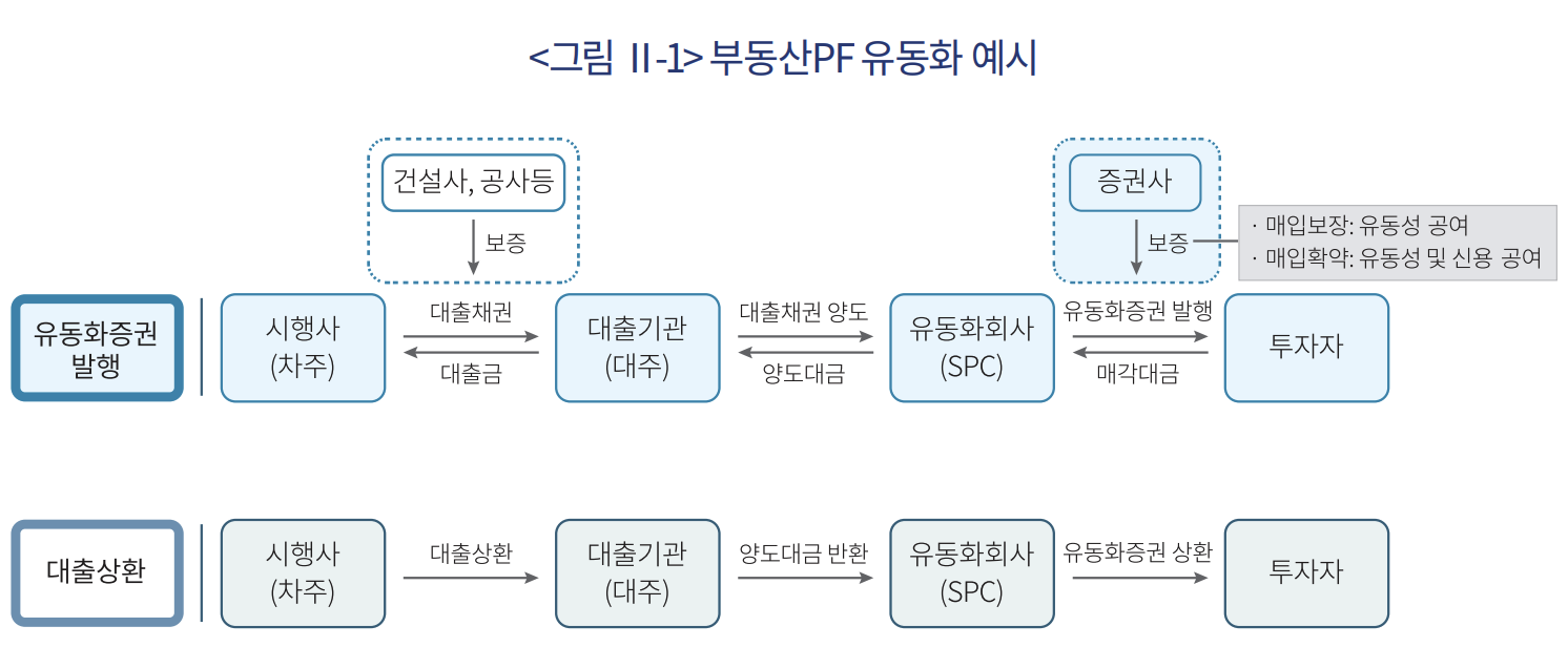 부동산 PF의 형태는 대표적으로 대출과 대출채권 유동화가 있습니다.
