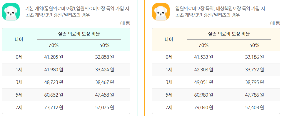 메리츠화재 펫퍼민트 홈페이지(ppmint.com)에 나와있는 가입예시입니다. 말티즈의 예상 보험료인데, 좌측은 기본 계약과 입원 의료비 특약 가입시 보험료이고, 우측은 기본 계약, 입원 의료비 특약, 배상책임보장 특약까지 가입했을 때의 보험료입니다. 얼마 차이가 안나는데, 배상책임보장 보험료가 크지 않습니다. 말티즈 기준 328원으로 나옵니다.