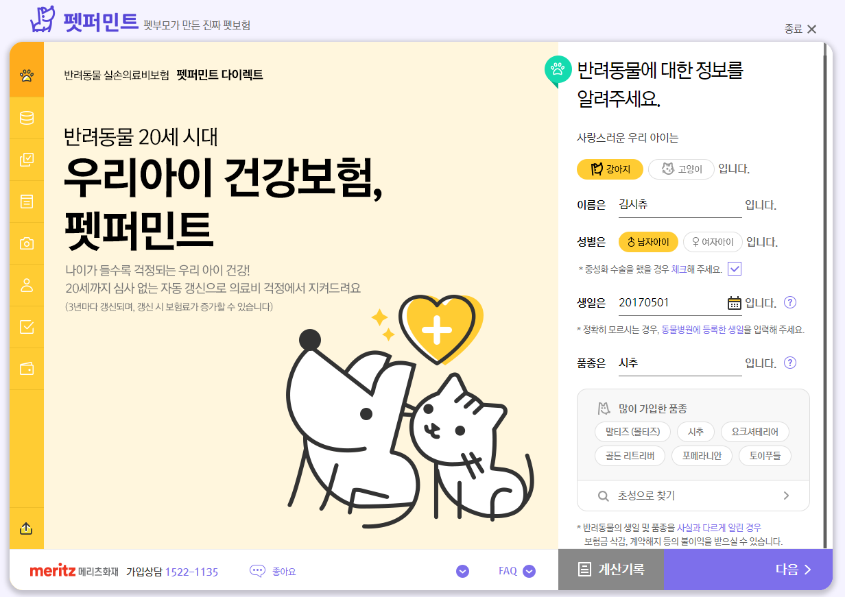 펫퍼민트 홈페이지에서 반려동물 정보를 입력해 보험료를 조회할 수 있고, 간편하게 다이렉트로 가입할 수도 있습니다.