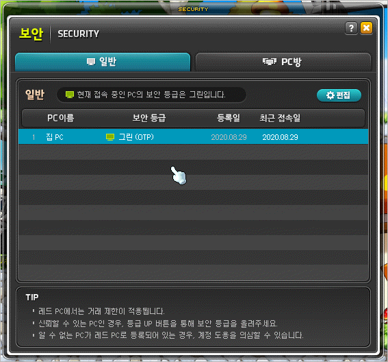 집에서 매번 OTP를 입력하기는 번거롭습니다. 지정PC를 설정하면 해당된 PC에서 넥슨OTP 인증 없이도 메이플을 플레이할 수 있습니다.