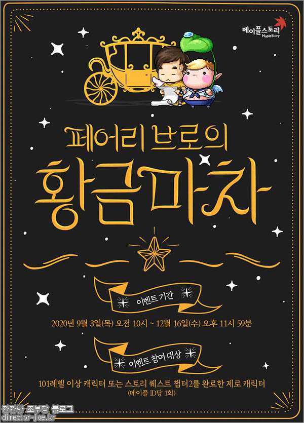 출석 이벤트인 '페어리 브로의 황금마차'가 시작됐습니다. 올해 12월 16일까지 대략 3달가량 진행됩니다. 메이플을 1시간 켜놓기만 하면 출석체크를 할 수 있는데요, 101레벨 이상 캐릭터(또는 스토리 퀘스트 챕터2 완료한 제로)가 필요한 점 유의해주세요.